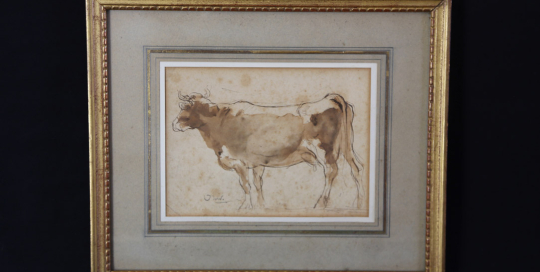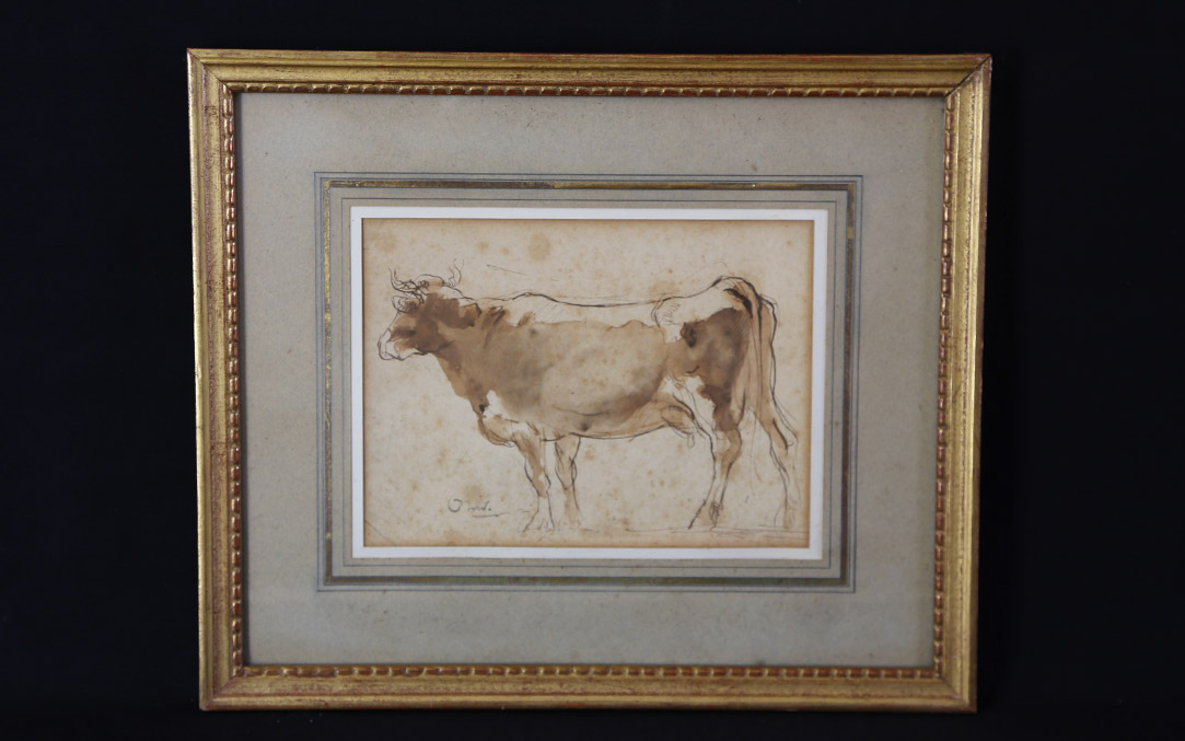lavis sur papier : Lavis sur papierVache Fin XVIIIeme début XIXème siècle Signature en bas à gauche non identifiée Bon état général, à noter le papier tâché par le temps Bel encadrement, cadre en bois doré style Louis XVISobre et de qualité Vitre de protection Estampe seule: 21 x 16 cm Cadre: 36 x 30,5 [...]