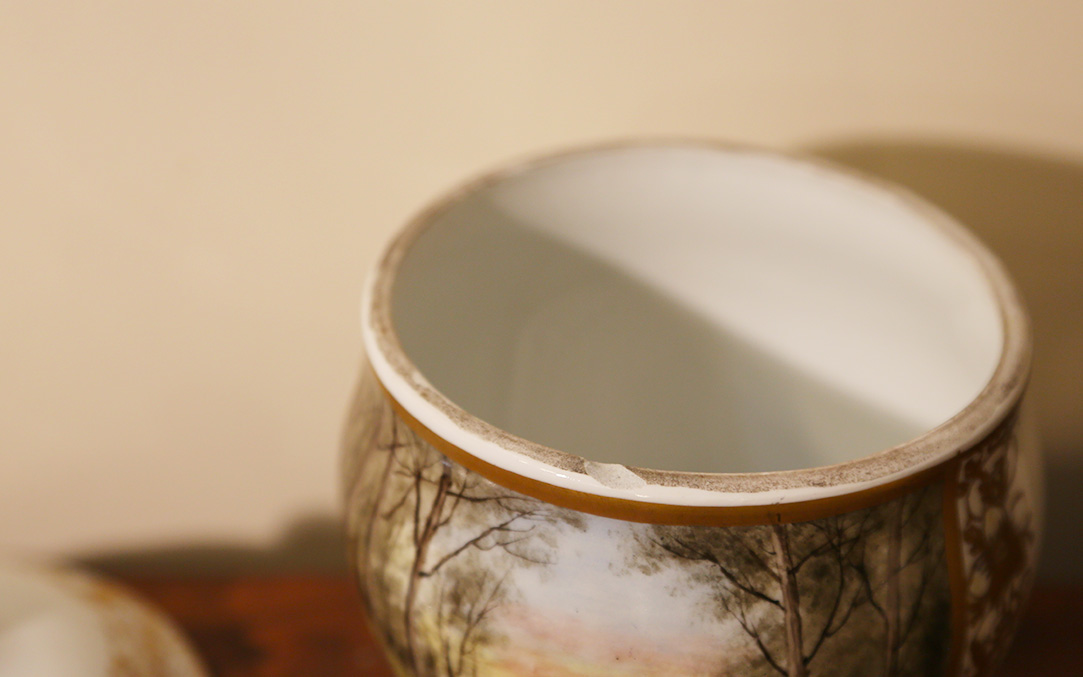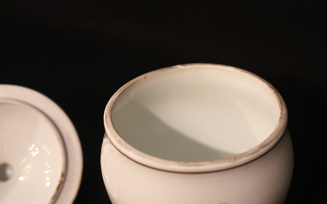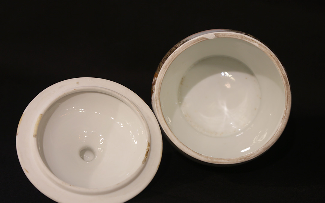 Good condition, a small crack around the rim of the neck that holds the lid