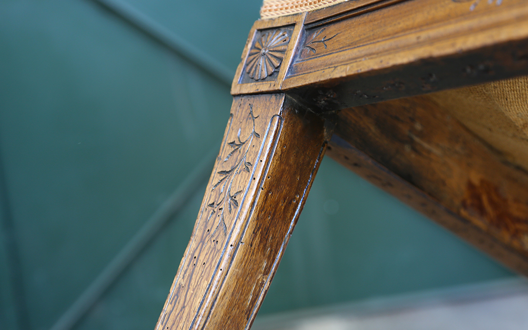 Motif floral très délicat, en creux sur les balustres frontales, dossier, piétement et bandeaux